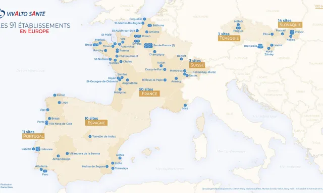 Créé en 2009 avec l’acquisition de 3 établissements bretons, le groupe Vivalto Santé compte aujourd’hui 50 hôpitaux et cliniques en France et étend son développement à l’Europe :